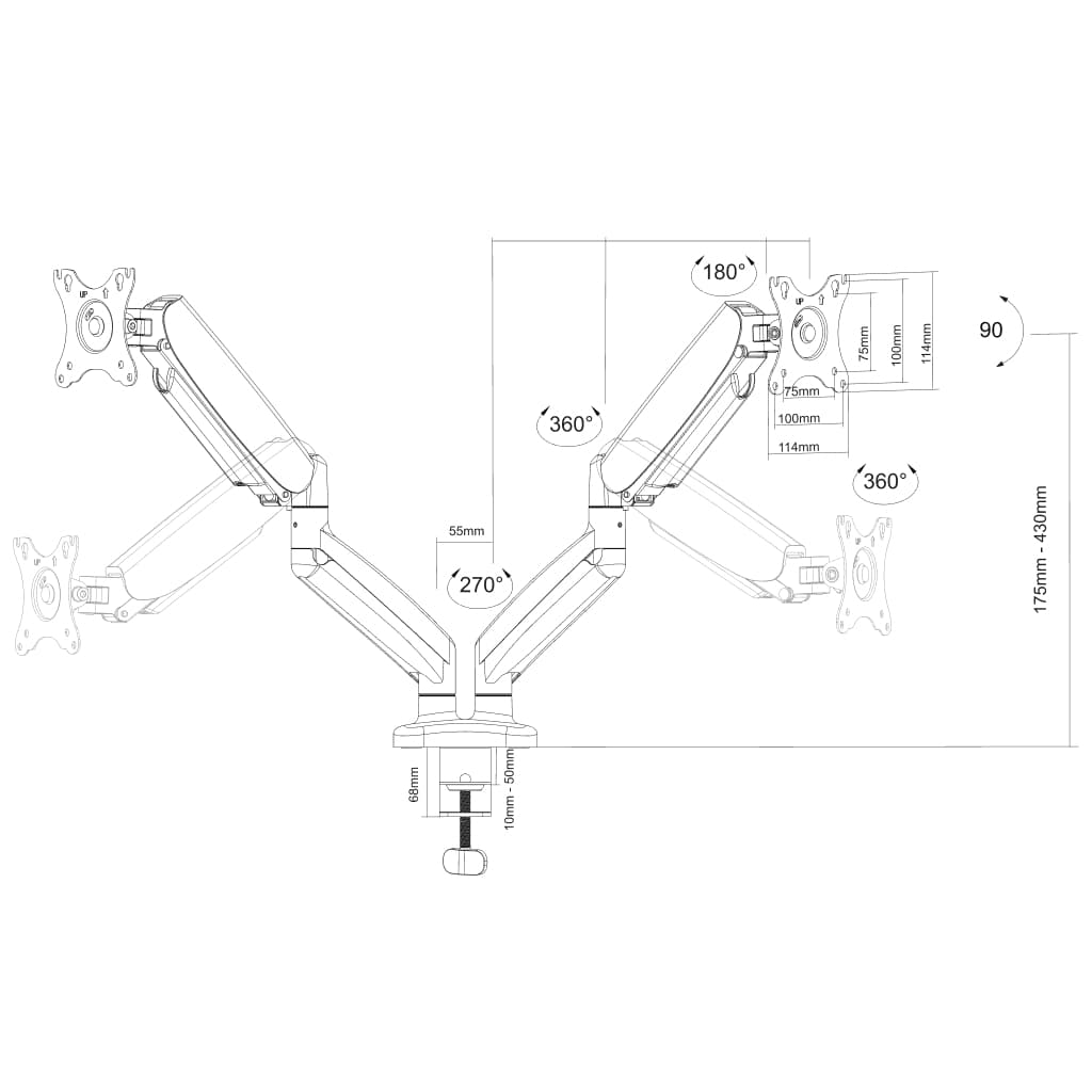 Compatible con monitores de 14” a 32” con montaje VESA 75x75 mm y 100x100 mm, y con un peso de entre 2 y 8 kg por brazo.