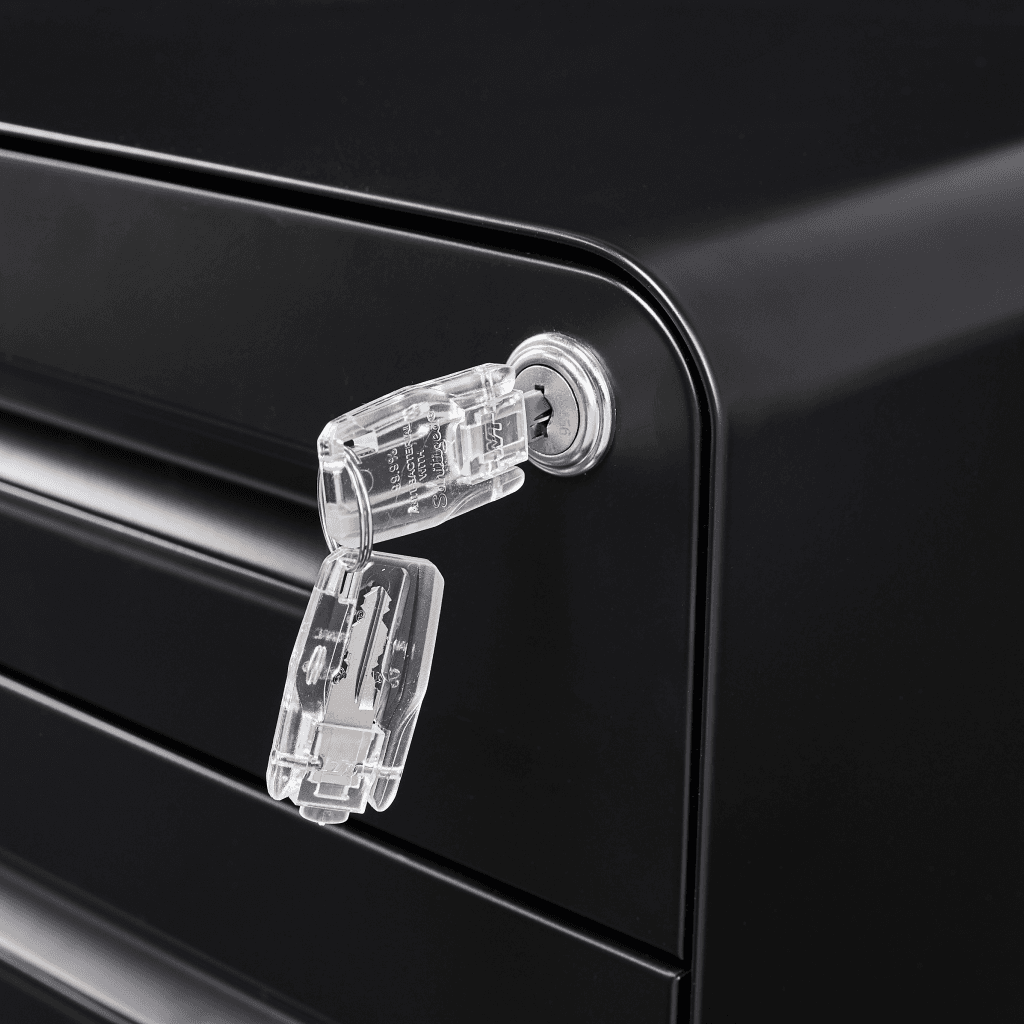 Cuenta con tres cajones con cerradura central y llave incluida. El cajón inferior está pensado para carpetas colgantes tamaño carta, con guías de deslizamiento completas para acceso total y sin esfuerzo.