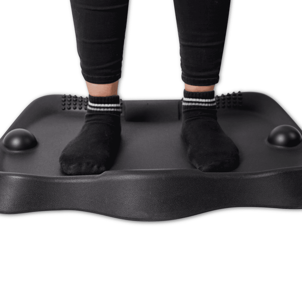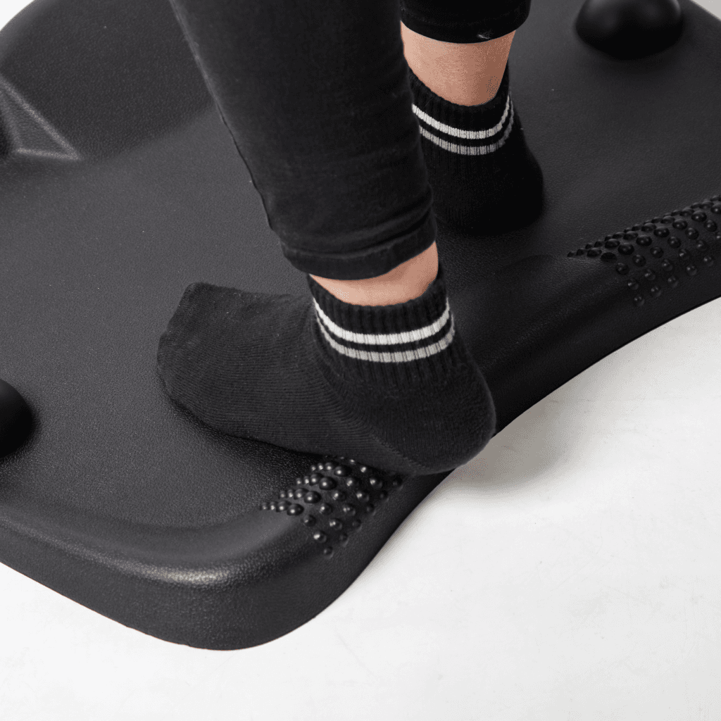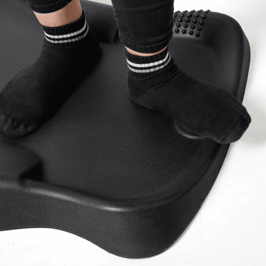 La base del Mat Pro permite reposicionarlo fácilmente con un pie, haciendo que la transición entre estar sentado y parado sea más fluida. Sus relieves estimulan movimientos subconscientes, como balanceos, estiramientos y desplazamientos que mantienen activos pies, tobillos y piernas.