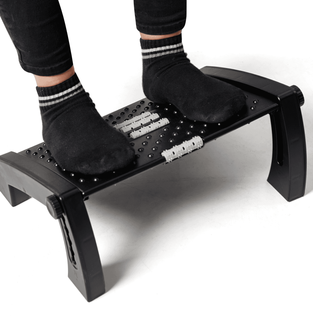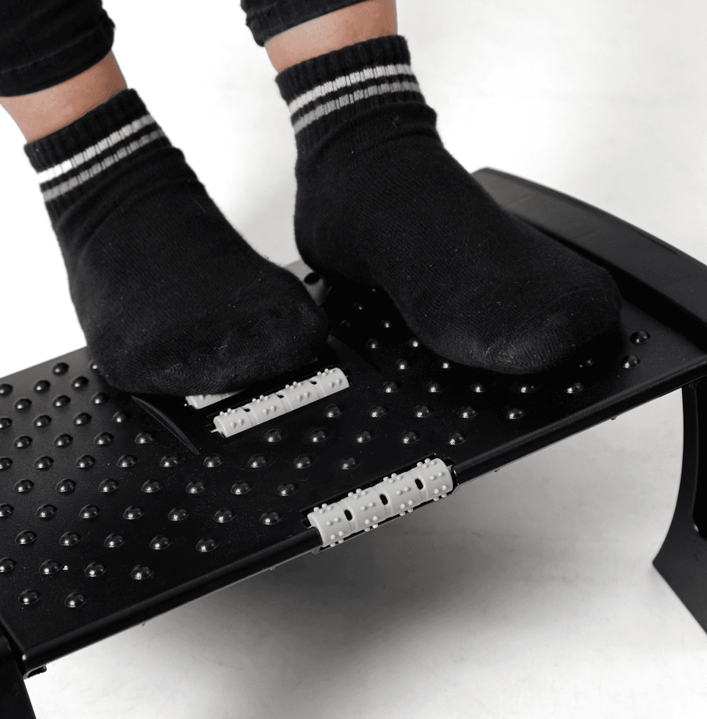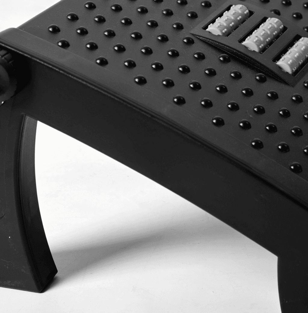 Su estructura fomenta el movimiento sutil de las piernas para mantener la circulación activa durante el día. La altura y el ángulo son ajustables según tus necesidades. Cuenta con superficie antideslizante y rodillos masajeadores que estimulan la planta de los pies.